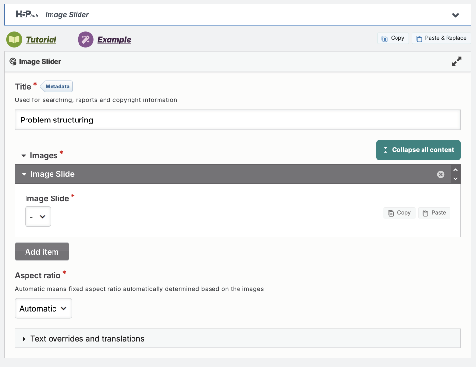 The Image Slide section of the editor gives me only a dropdown box with nothing in it, and I see no way to add any content aside from the title.